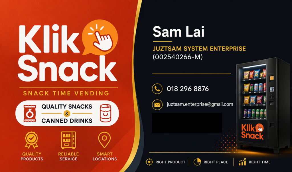 Klik Snack, operated by JUZTSAM SYSTEM ENTERPRISE, delivers innovative vending solutions designed to create passive income streams with zero hassle. Our commitment to convenience, reliability, and profitability drives everything we do, ensuring property owners and business managers achieve lasting success.